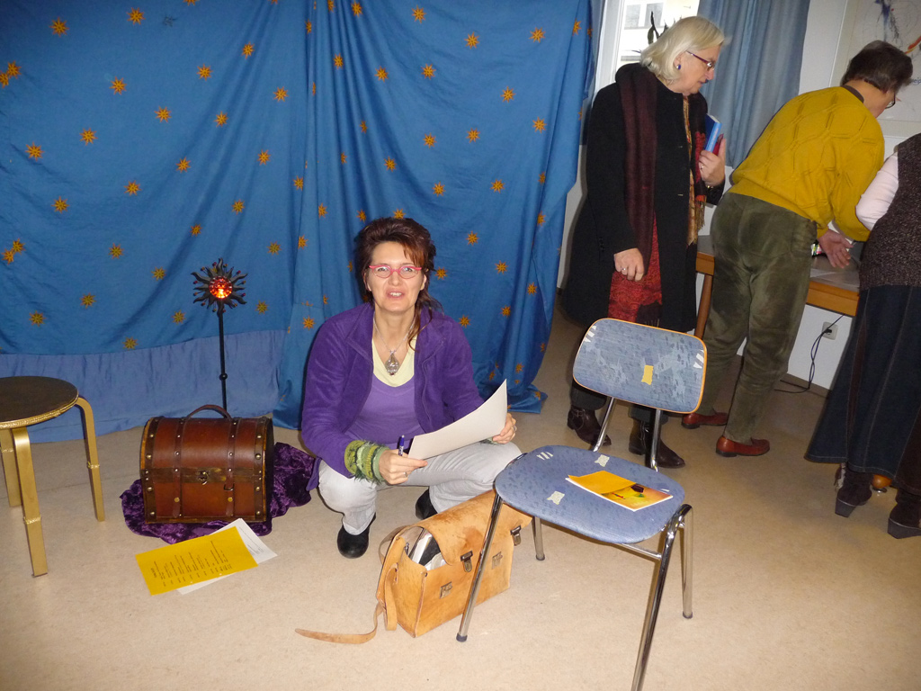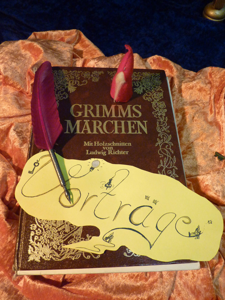 Jeweils eine kleine schriftliche Hausaufgabe z. B. das Deuten eines Symbols (Brunnen oder Baum,…), das Ausdenken eines Rätsels für das eigene erlernte Märchen, oder auch nur das Zusammenstellen eines kleinen Märchenauftrittskoffers mit Kerze, Edelstein, Schmucktuch…sorgen dafür, dass in der Zeit zwischen den Kursen das Thema Märchen im Alltag nicht verloren geht.